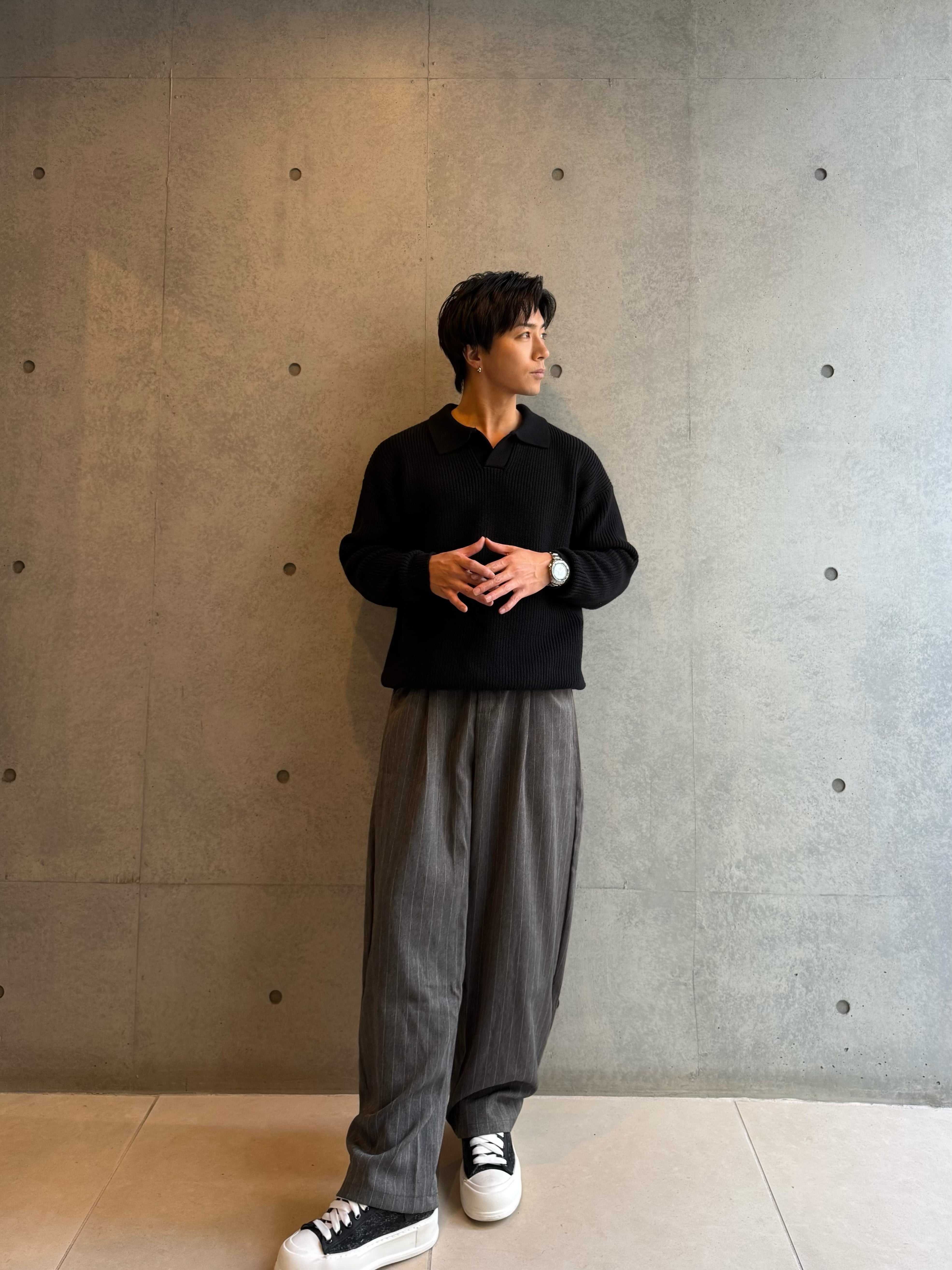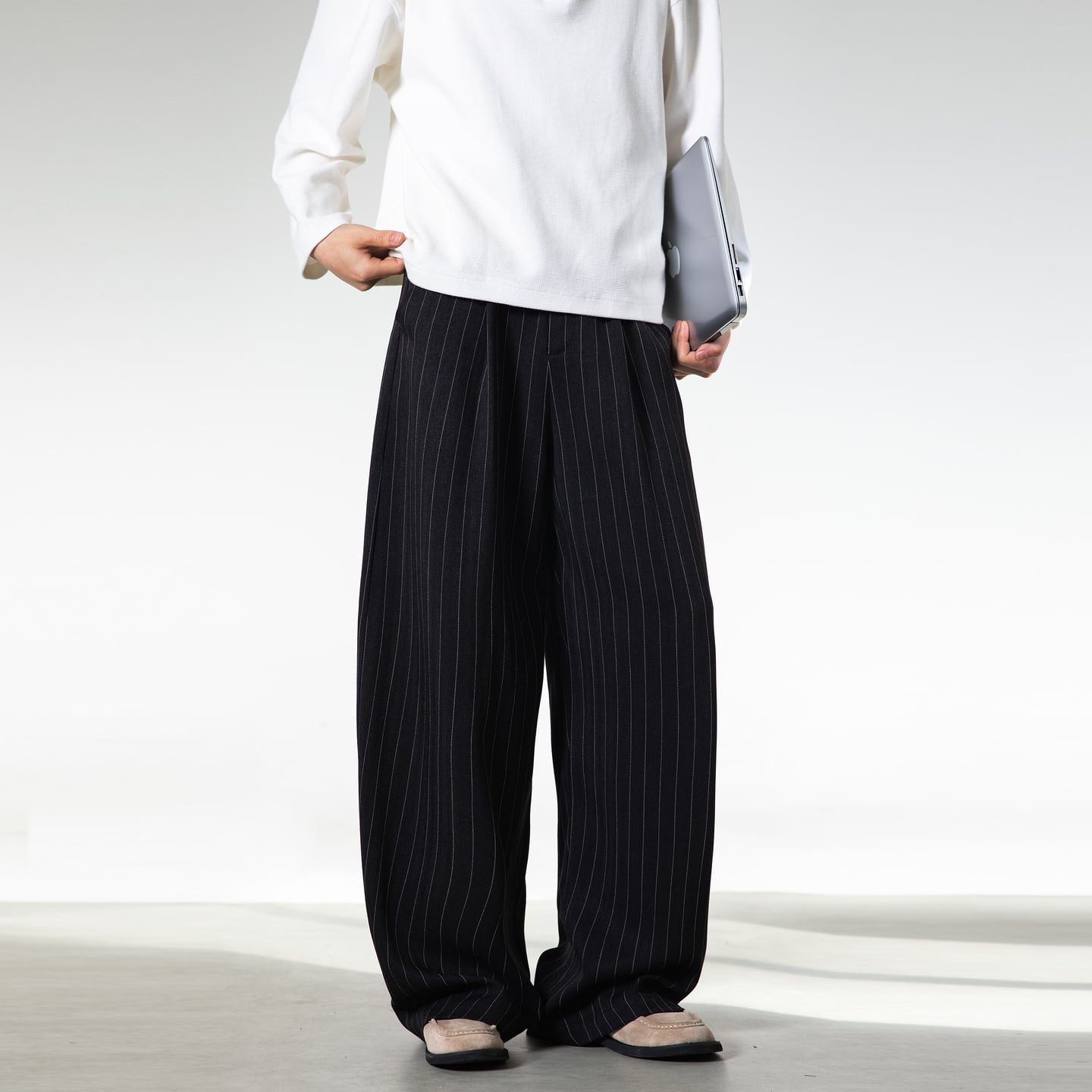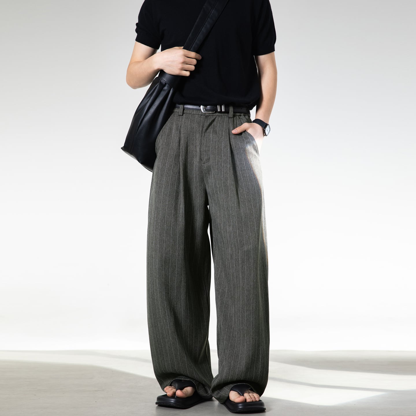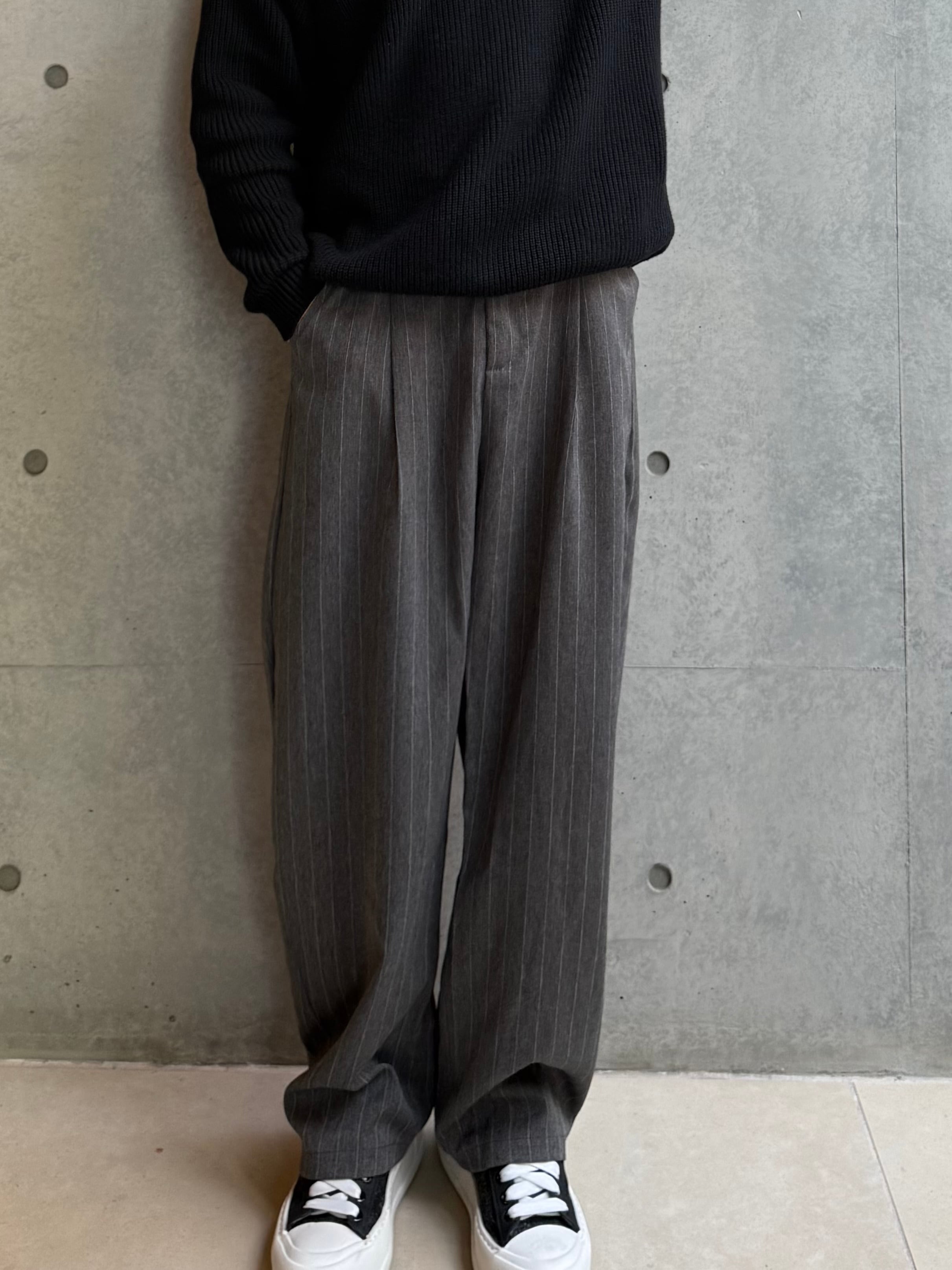 ルーズシルエットで程よいキレイめ感とリラックス感を演出してくれるストライプ柄のワンタックパンツ